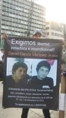 Otra cartulina lleva el nombre de Daniel García Vázquez, 24 años, estudiante del IPN que “se dirigía a la Plaza de Computación con un par de amigos. Cuando llegó y se encontró con el enfrentamiento, corrió y cayó. Es cuando lo detuvieron. Fue obligado a tocar una granada de la que ahora le acusan estaba a punto de usarla”.