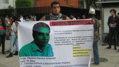 Una de las pancartas llevadas en la marcha, por ejemplo, fue de Jorge Dionisio, Barrera Jiménez, 35 años, quien estudió Ciencia Política en la FCPyS de la UNAM. Según la sinopsis circulada en las redes sociales, él “salió con su esposa e hija para comprar zapatos para ésta última en el Centro Histórico. Fue detenido arbitrariamente cuando exigía a los policías que dejaran de golpear a otro detenido arbitrariamente”.