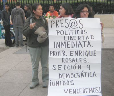 Después de la reunión un grupo muy reducido procedió al Zócalo, donde la Sección 9 del magisterio ha establecido un plantón afuera de las oficinas del Gobierno del Distrito Federal para exigir libertad para el profesor Enrique Rosales y los demás presos políticos.