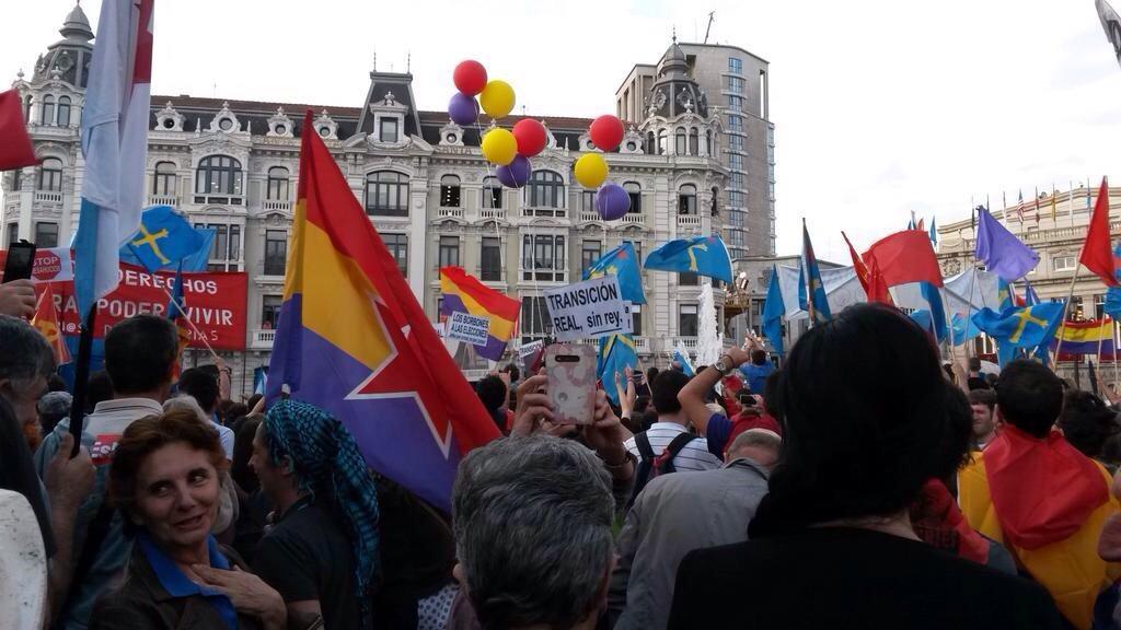 Estos Borbones, a los tiburones y La crisis es una estafa, fueron algunos de los lemas coreados por representantes de colectivos sociales, sindicales y políticos en medio de una profusión de banderas republicanas al paso de la caravana real por las calles de Oviedo.
